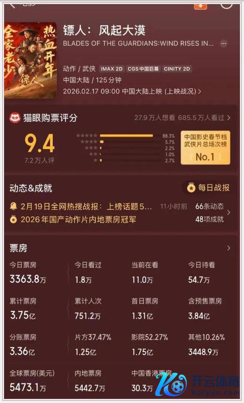 我们平直把这几天的数据摊开来说(数据来自猫眼专科版、灯塔专科版和艺恩等公开平台):大年月吉 《镖东谈主》首日票房1.38亿操纵 排片13.8%,上座率在几部大片里垫底,排名第四;初二票房掉到1.21亿,跌了12.3% 如故第四;初三1.15亿,跌幅收窄到5% 排名没变,但“跌不动了”的苗头也曾冒出来了;到了初四,票房陡然窜到1.68亿 逆跌46.1%,排片升到18.2%,平直冲上圈套日亚军;初五凌晨数据看 单日票房依然稳稳守在第二 累计票房也曾打破8亿。