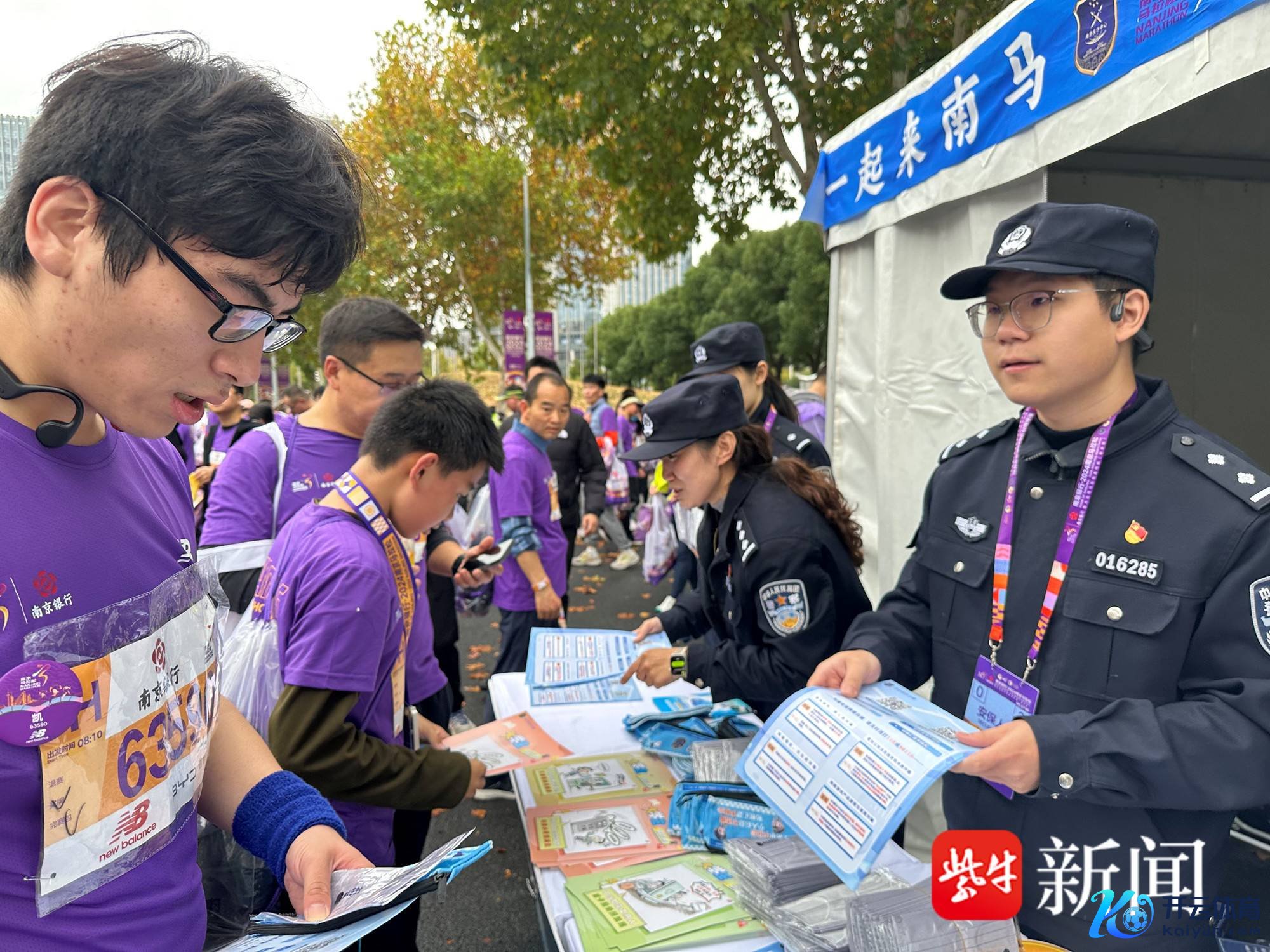 此外,在吵杂的赛说念中,十几名非凡跑者引起了记者的雅致,通信托上的号码布印着“切勿将现款、黄金交给生分东说念主——全民反诈,你我同业”,他们是南京警方护跑员。“我主要负责玄武区这一段赛说念,从龙蟠路到玄武湖环湖路,全程约5公里。这段路程,我和共事们穿插在通顺员中,为参赛选手护跑。”玄武分局护跑员先容。