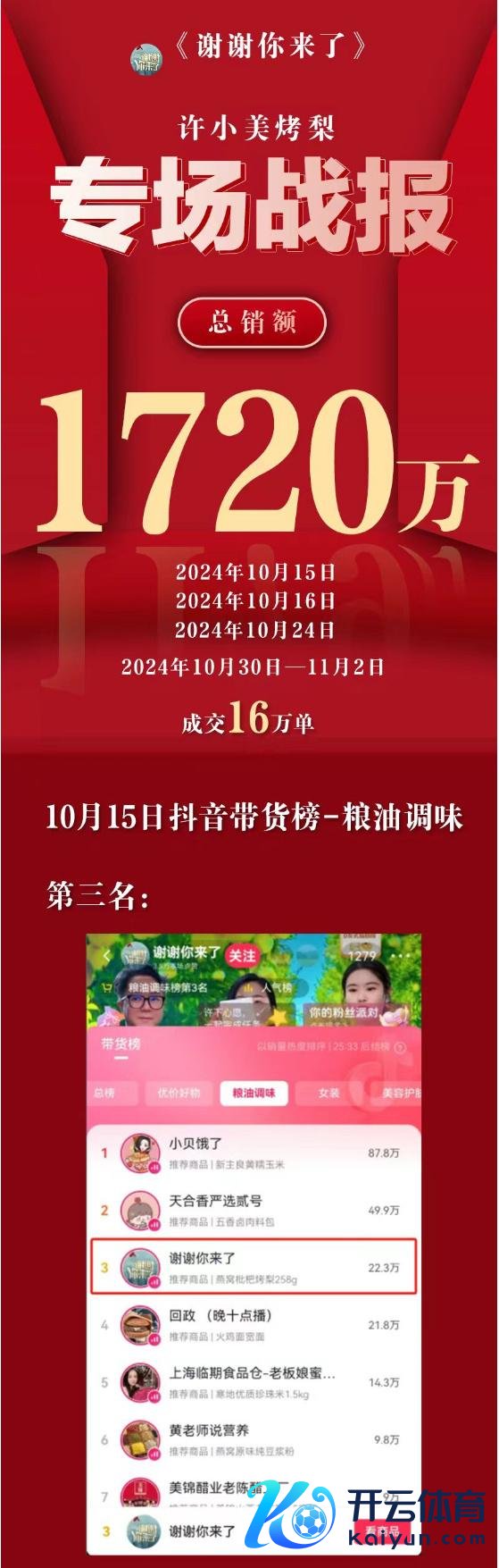 6天技巧,《谢谢你来了》阔别在微信视频号及抖音直播间进行了“许小好意思烤梨”专场直播带货,4场直播认为成交16万单,总销量高达1720万元。其中,在10月15日的抖音带货榜上,《谢谢你来了》直播间烤梨专场直播以96.7万的单场销售量荣登抖音平台粮油调味类居品销量第3名。在《谢谢你来了》微信视频号的3场直播,烤梨单品销量更是一举拿下1623.3万的好得益。