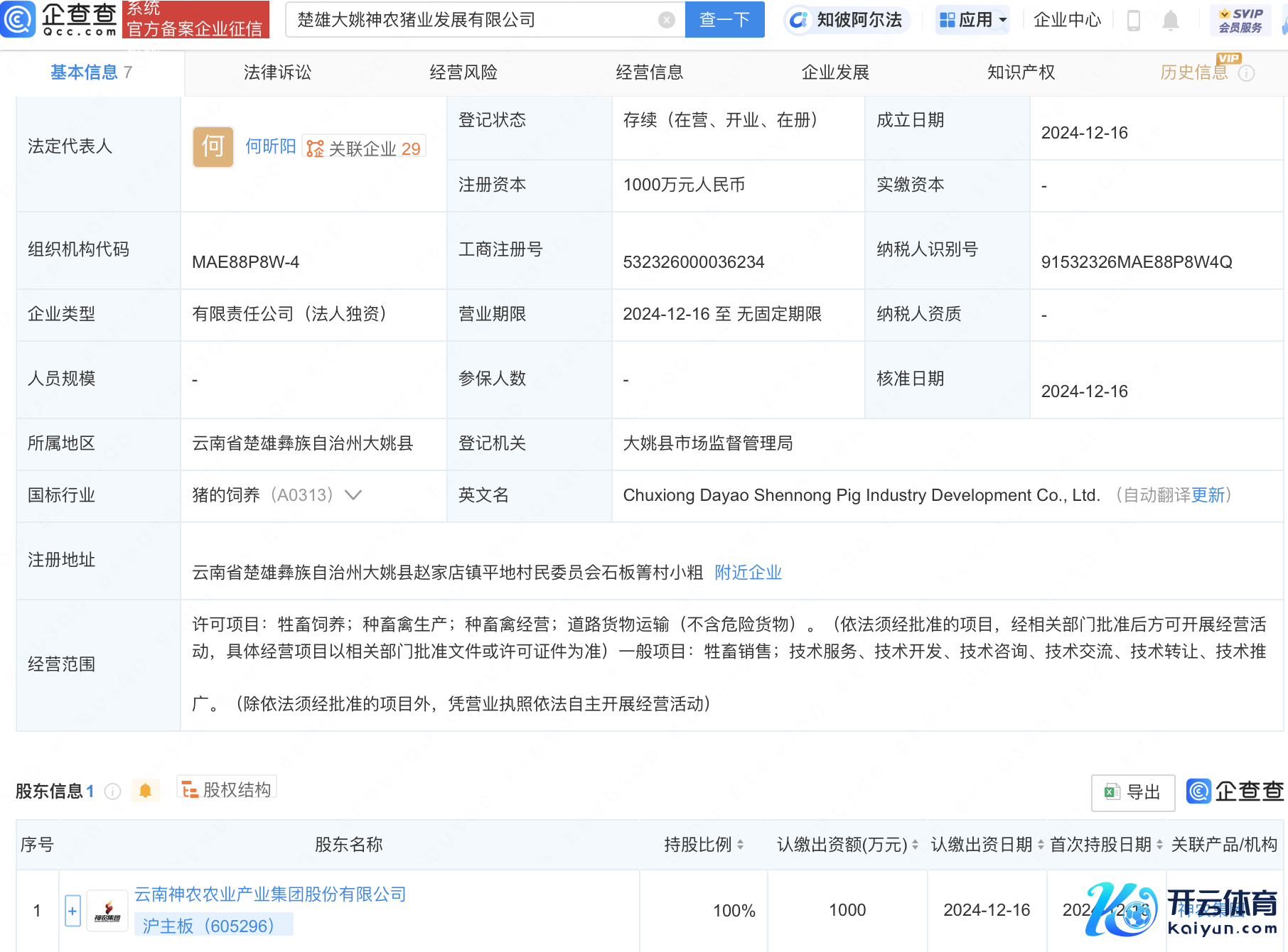 企查查APP显现开云(中国)Kaiyun·体育官方网站-登录入口,近日,楚雄大姚神农猪业发展有限公司修复,法定代表东谈主为何昕阳,注册成本1000万元东谈主民币,筹谋界限包含:畜生饲养;种畜禽分娩;种畜禽筹谋;谈路货品运载(不含危机货品)等。企查查股权穿透显现,该公司由神农集团(605296)全资握股。