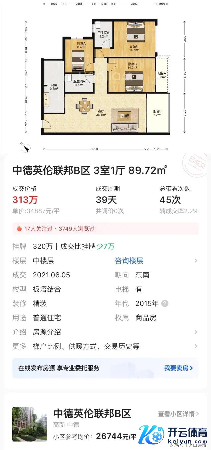 2021年6月5日成交的数据暴露,单价为34887元每平米,成交周期只是39天。