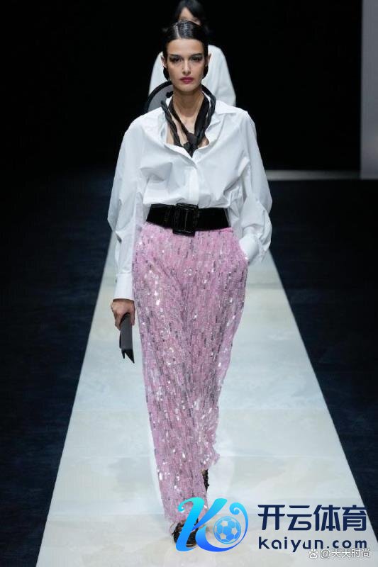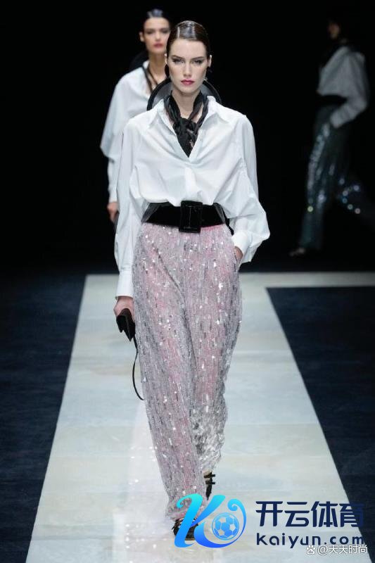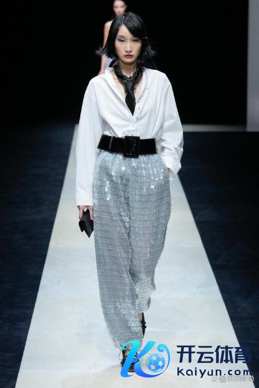 白顶暗底一直是严谨和保守的代名词。但不是阿玛尼!他莫得深色的下装,而是宽大的玄色腰带和玄色领带。办公室衬衫和亮片长裤的完好组合。