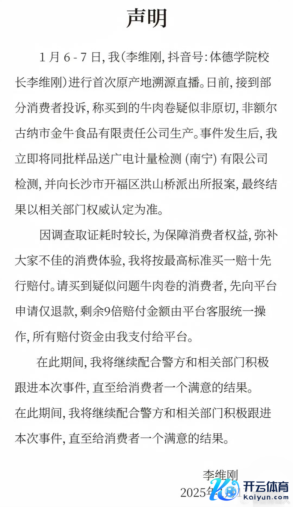 1月17日,李维刚发布声明称,先按假一赔十进行赔付。