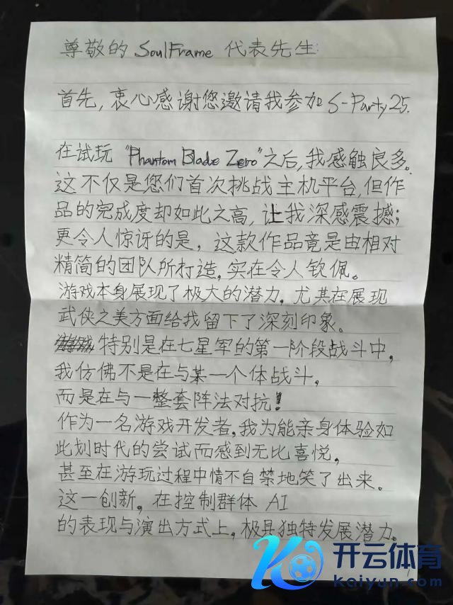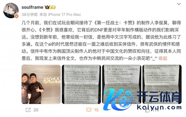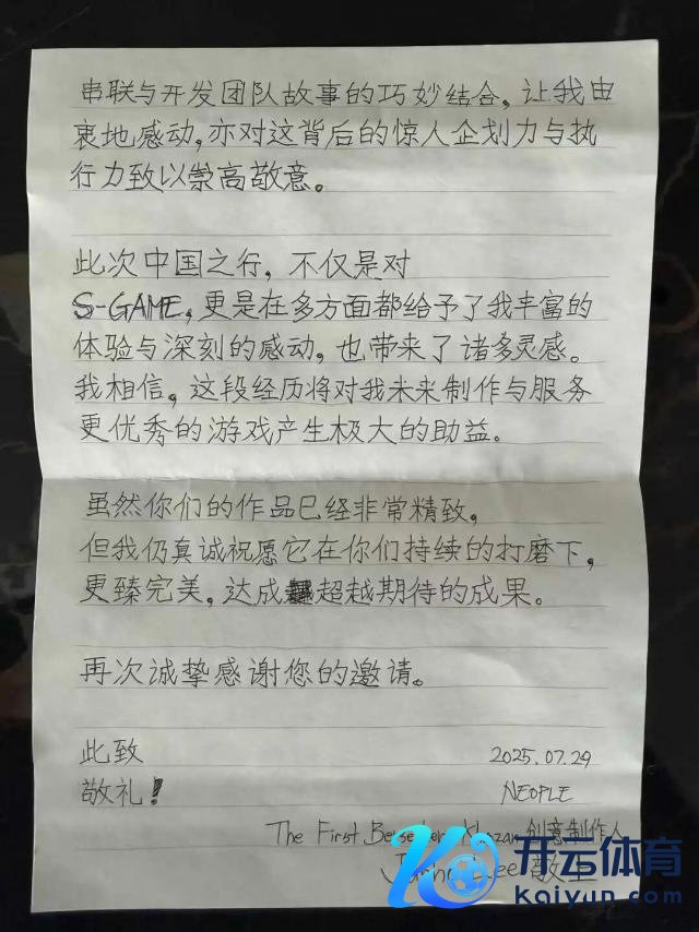 以下为《第一狂战士:卡赞》制作主说念主李俊昊的中语手写信本体: