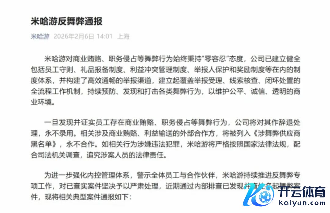 米哈游在通报中明确暗示,关于交易行贿、职务侵占等作弊步履,绝不会有涓滴的姑息和猖狂。一朝发现并确认职工存在此类步履,公司将绝不徜徉地将其除名,且永不拜托。